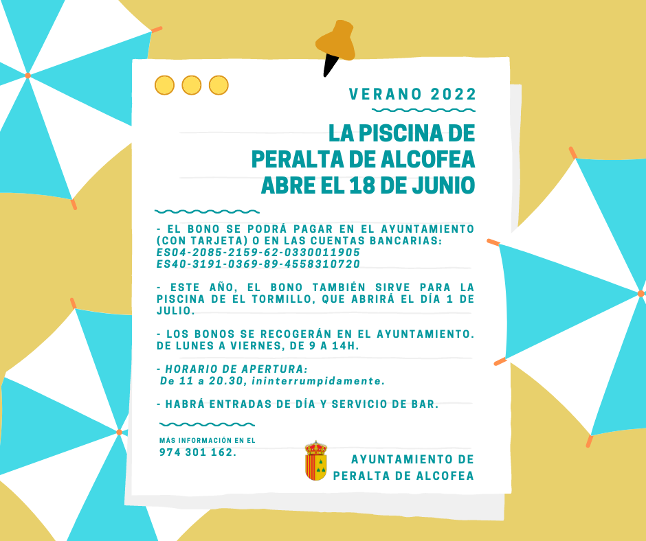 Las piscinas de Peralta de Alcofea abren el próximo sábado, 18 de junio.