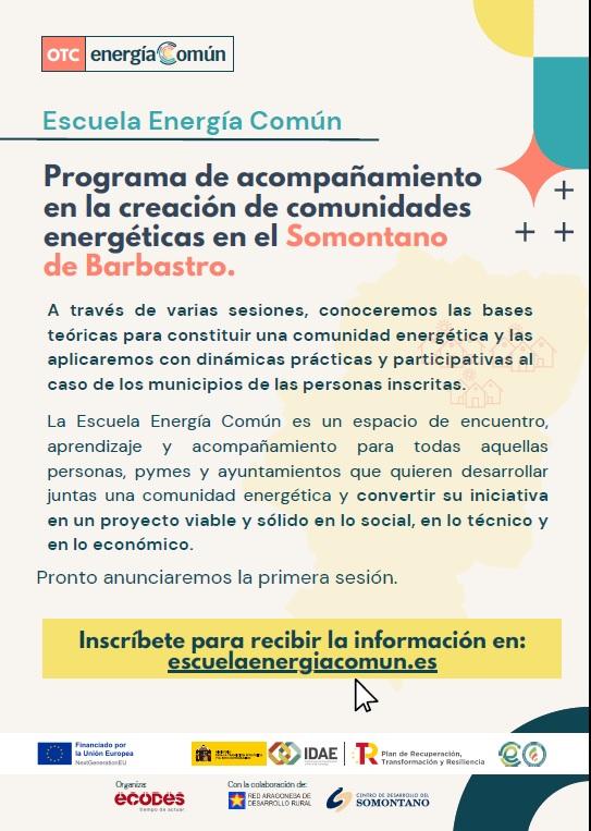ECODES está impartiendo en los distintos territorios de Aragón, unas sesiones de la Escuela de Energía Común: se trata de un programa de acompañamiento, asesoramiento, formación y difusión sobre las Comunidades Energéticas.